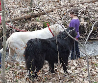 A few days ago we decided to give Ang a break and babysit the kids for the afternoon. It was such a nice day out that a walk in the woods was a must. However our dogs Harley & Bear simply refused to be left home alone, so they had to come along too. Of course we couldn't let them both run together so Wifey had to keep Harley on a leash.